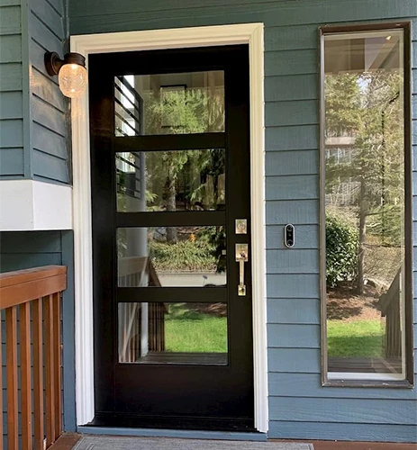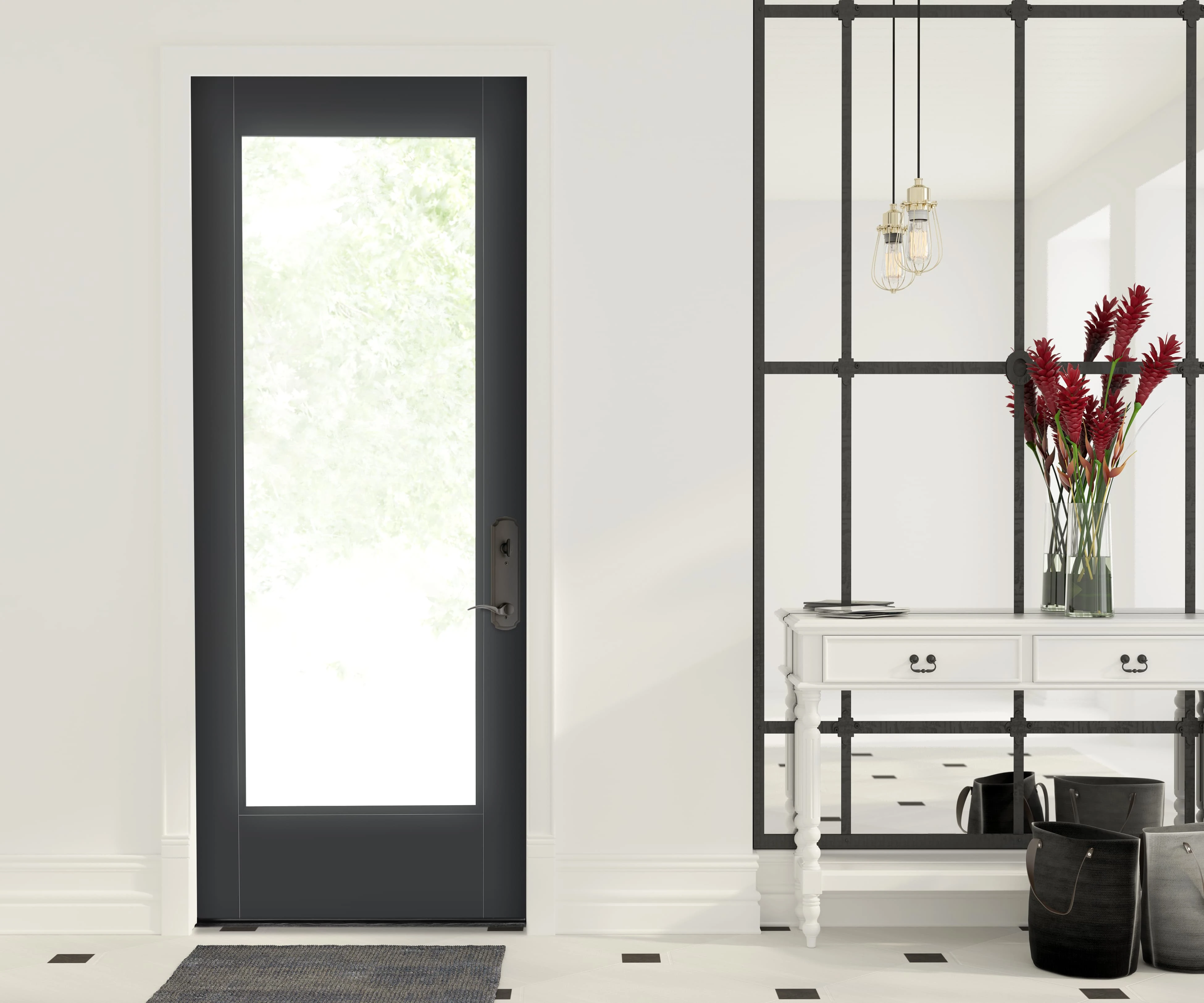 Further the traditional look of your front door with grilles and classic hardware. For a more contemporary look with sleek profiles, choose a fiberglass front door with flush glazed glass. This popular panel style creates a light and airy entryway with 1/2 light, 3/4 light and full light options.